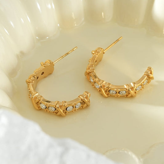 ELICA Gold: Zirconia Embedded Hoop Earrings with Ornate Detail & Crisscross Accents