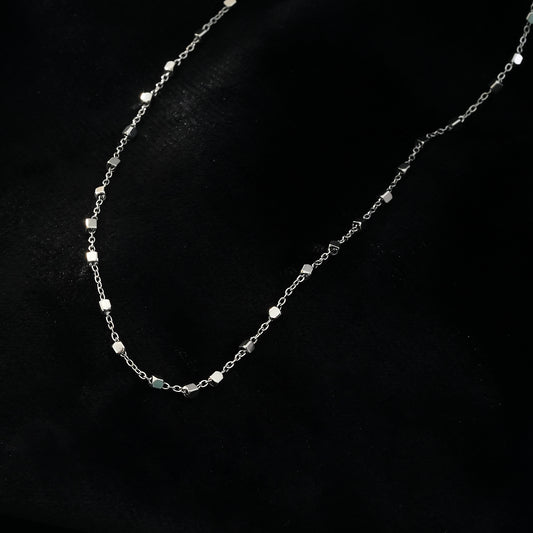 AUREOLE: Essential Daily Chain with Delicate Square Beads in Silver Toned White Gold.