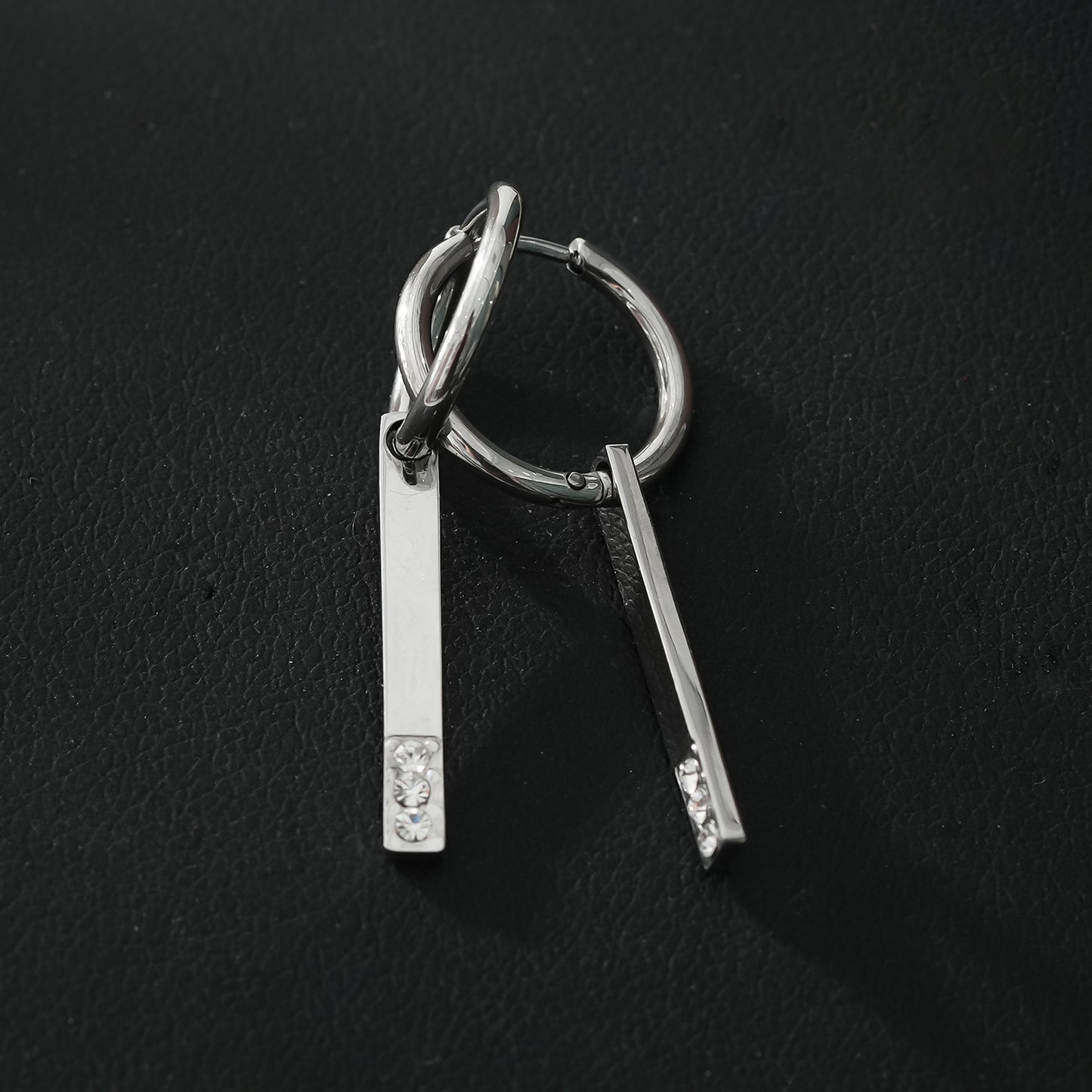 Elevate your style with this exquisite minimalist drop charm hoop earrings, This match stick style pendant is embedded with a trio of sparkling AAA zirconia gemstones, offering a cruelty-free and ethically sourced alternative that mimics the brilliance of diamonds.